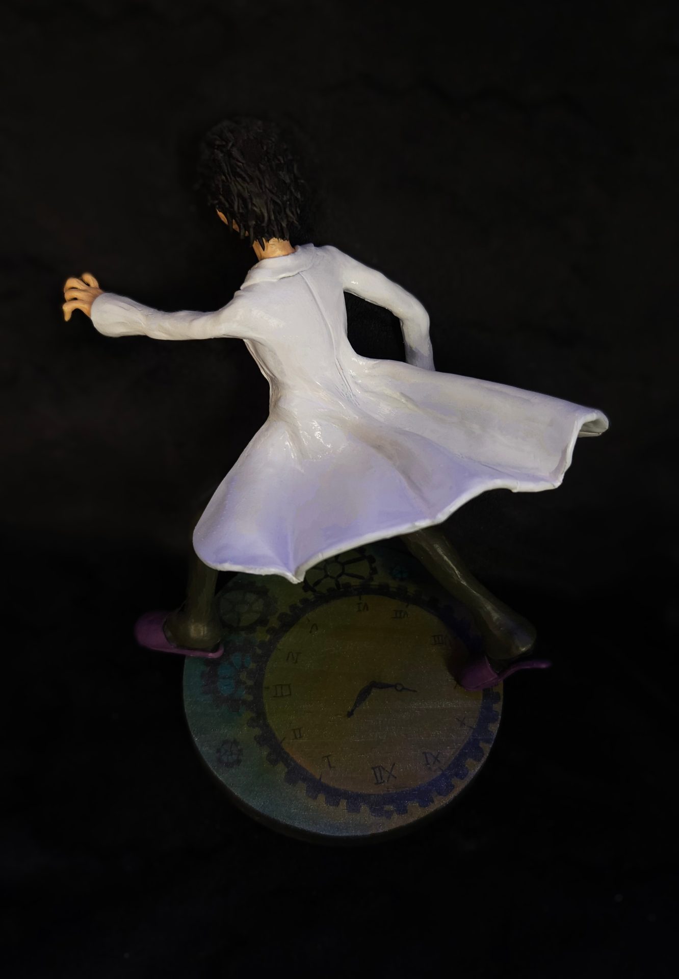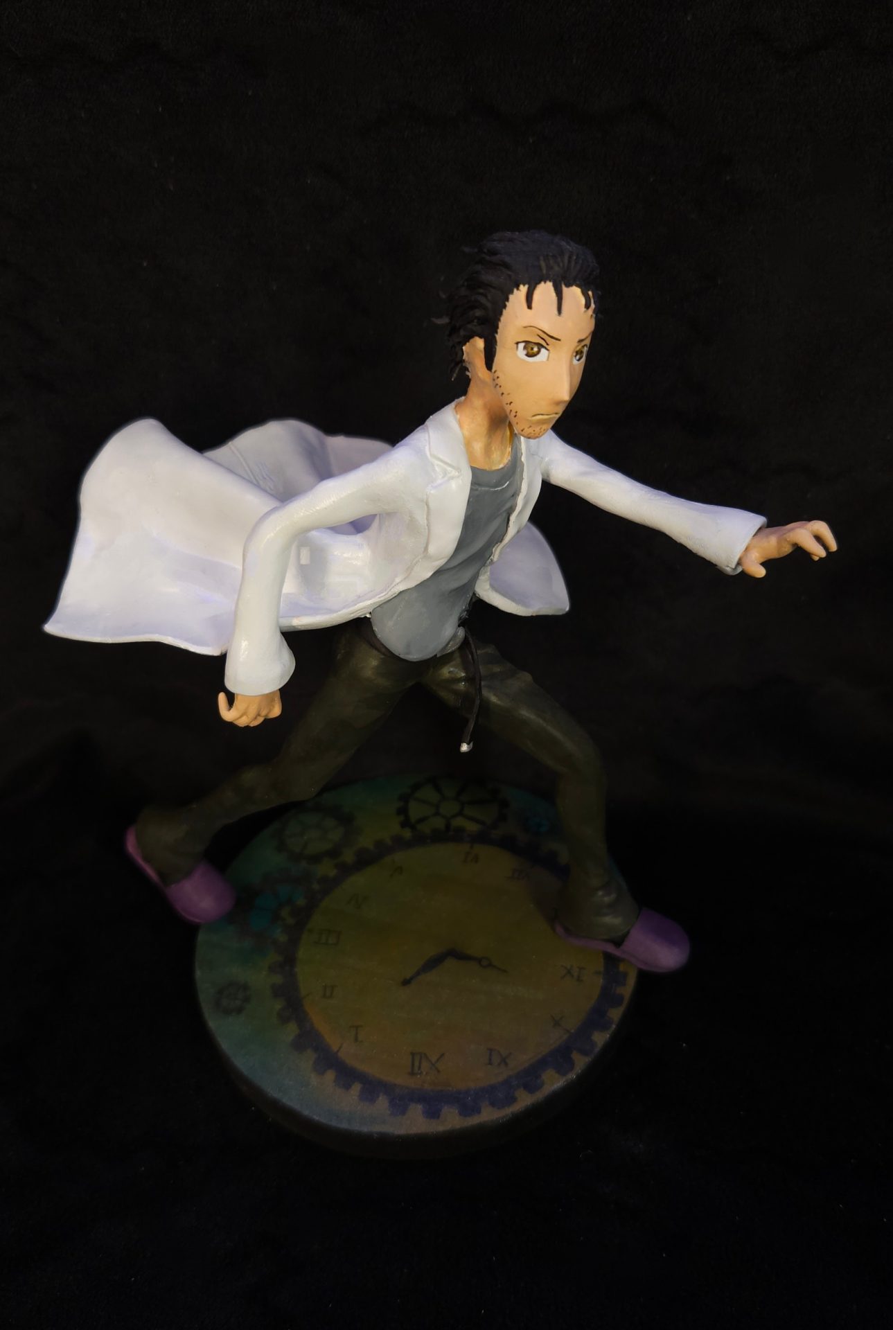 Okabe est figé dans sa posture déterminée, les yeux chargés de choix impossibles, debout sur un socle steampunk orné de rouages, d’horloges, et de tout ce qu’il faut pour se rappeler que le temps… ne pardonne rien.